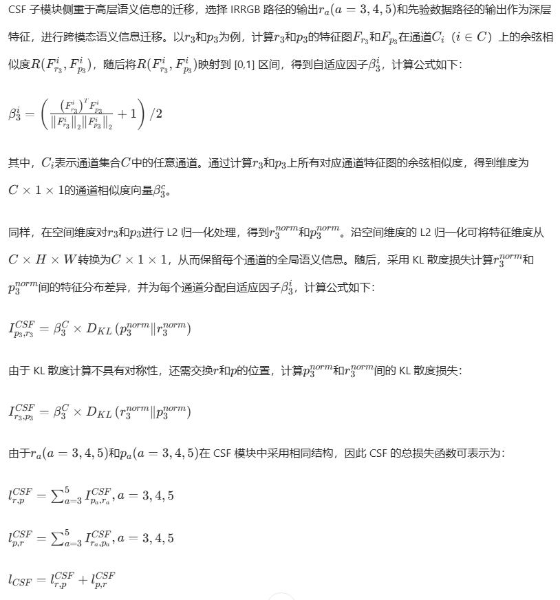CSF 子模块侧重于高层语义信息的迁移,选择 IRRGB 路径的输出\(r_{a}(a=3,4,5)\)和先验数据路径的输出作为深层特征,进行跨模态语义信息迁移。以\(r_{3}\)和\(p_{3}\)为例,计算\(r_{3}\)和\(p_{3}\)的特征图\(F_{r_{3}}\)和\(F_{p_{3}}\)在通道\(C_{i}\)(\(i\in C\))上的余弦相似度\(R(F_{r_{3}}^{i},F_{p_{3}}^{i})\),随后将\(R(F_{r_{3}}^{i},F_{p_{3}}^{i})\)映射到 [0,1] 区间,得到自适应因子\(\beta_{3}^{i}\),计算公式如下: