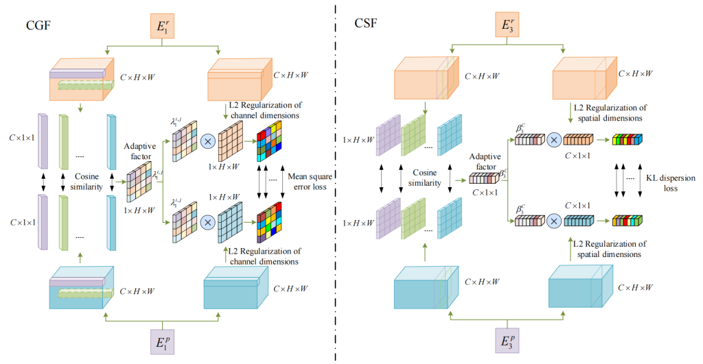 - 跨模态语义特征迁移模块CSFCSF聚焦于几何与语义维度的跨模态特征交互,输入的是两个模态的编码器特征。1)特征降维与相似度计算:对两个输入特征分别进行空间维度重塑,将C×H×W转换成1×H×W,聚焦于空间语义信息,得到空间级描述子,然后计算这些描述子的余弦相似度,衡量空间语义的相关性。2)自适应因子生成与特征加权:基于余弦相似度生成的自适应因子,用于对原特征的空间维度进行加权,对原特征进行空间维度的L2正则化(L2 Regularization of channel dimensions),增强空间语义特征的稳定性;3)损失函数约束:对加权后的特征计算KL散度损失,通过KL散度衡量两个模态特征在语义分布上的差异,优化跨模态语义融合的一致性。