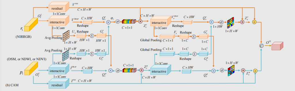 - 输入与分支初始化模块输入两个模态的特征,分别是IRRGB遥感多光谱遥感图像以及先验数据路径(如DSM/NDWI/NDVI等),每条路径都通过残差连接(residual)和交互模块(interactive)生成两类特征向量