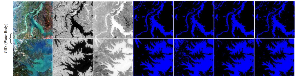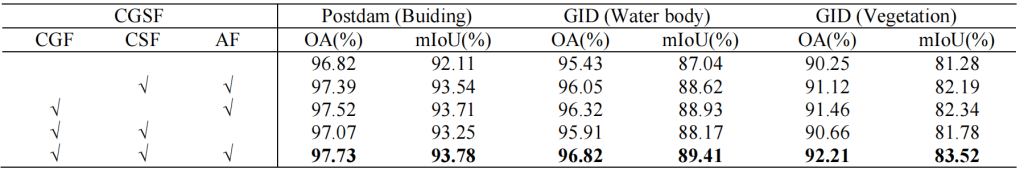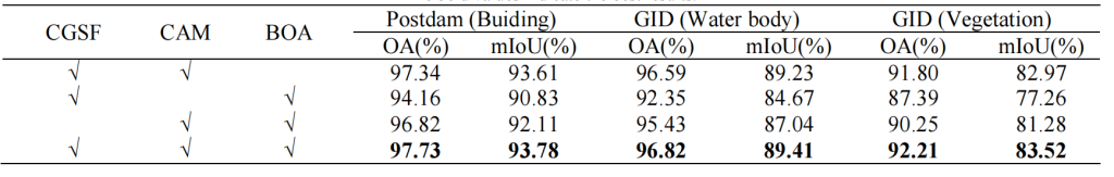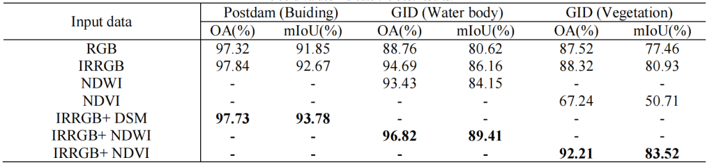 表 7:在 Potsdam(建筑物)数据集、GID(水体)数据集与 GID(植被)数据集上的实验结果