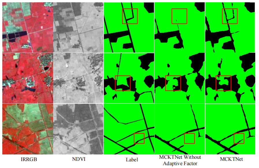 图 6:MCKTNet 与不含自适应因子(AF)的 MCKTNet 在 GID(植被)数据集上的语义分割结果对比