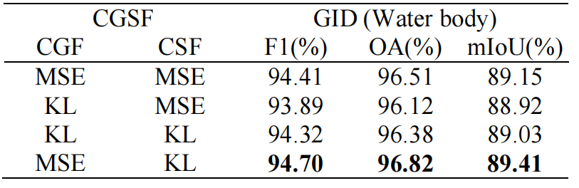 均方误差(MSE)损失和 KL 散度损失均可实现跨模态知识迁移。通过在 CGF 模块和 CSF 模块中使用不同损失函数,确定各模块最适合的跨模态特征分布损失计算方法。以表 2 中的水体检测任务为例,CGF 模块使用 MSE 损失比使用 KL 损失的 mIoU 提升 0.38%;CSF 模块使用 KL 损失比使用 MSE 损失的 mIoU 提升 0.26%。MSE 损失与 KL 散度损失在跨模态知识迁移中特征迁移能力的差异在于:MSE 损失通过最小化预测值与真实值的平方误差,更关注数值准确性和局部细节,适合迁移几何等浅层特征;而 KL 散度损失通过衡量两个概率分布间的距离,强调分布的整体相似性和结构,能捕捉数据中的深层语义信息,因此更适合迁移语义等深层特征。