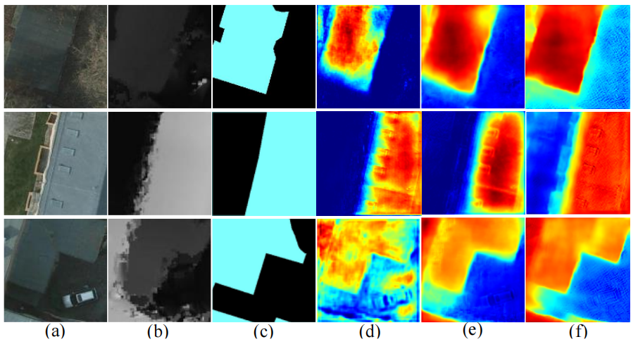 (a)表示输入图像(IRRGB 多光谱图像),(b)表示输入的 DSM 数据(数字表面模型),(c)表示真实标签,(d)表示不含 CAM 模块的模型,(e)表示不含 BOA 模块的模型,(f)表示同时包含 CAM 和 BOA 模块的完整 MCKTNet。