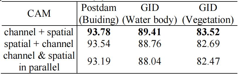 表 4:通道注意力与空间注意力子模块不同组合的平均交并比(mIoU)对比(单位:%)