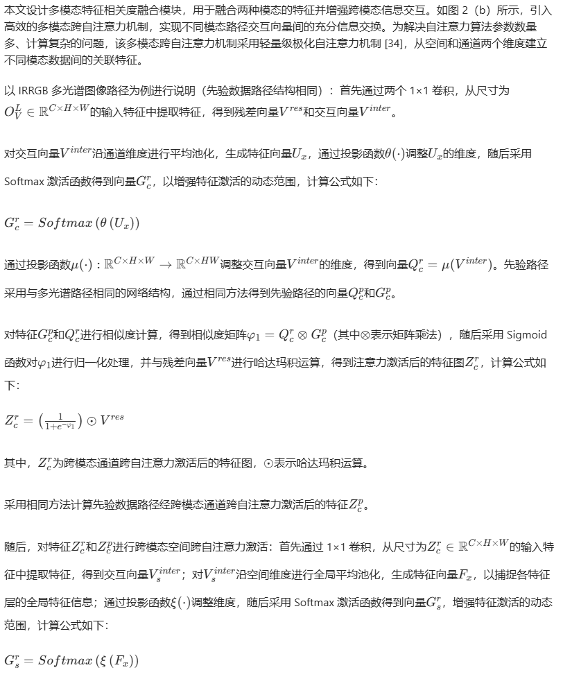 本文设计多模态特征相关度融合模块,用于融合两种模态的特征并增强跨模态信息交互。如图 2(b)所示,引入高效的多模态跨自注意力机制,实现不同模态路径交互向量间的充分信息交换。为解决自注意力算法参数数量多、计算复杂的问题,该多模态跨自注意力机制采用轻量级极化自注意力机制 [34],从空间和通道两个维度建立不同模态数据间的关联特征。以 IRRGB 多光谱图像路径为例进行说明(先验数据路径结构相同):首先通过两个 1×1 卷积,从尺寸为(O_{V}^{L}\in\mathbb{R}^{C×H×W})的输入特征中提取特征,得到残差向量(V^{res})和交互向量(V^{inter})。对交互向量(V^{inter})沿通道维度进行平均池化,生成特征向量(U_{x}),通过投影函数(\theta(\cdot))调整(U_{x})的维度,随后采用 Softmax 激活函数得到向量(G_{c}^{r}),以增强特征激活的动态范围,计算公式如下:(G_{c}^{r}=Soft max \left(\theta\left(U_{x}\right)\right))通过投影函数(\mu(\cdot):\mathbb{R}^{C×H×W}\to\mathbb{R}^{C×HW})调整交互向量(V^{inter})的维度,得到向量(Q_{c}^{r}=\mu(V^{inter}))。先验路径采用与多光谱路径相同的网络结构,通过相同方法得到先验路径的向量(Q_{c}^{p})和(G_{c}^{p})。对特征(G_{c}^{p})和(Q_{c}^{r})进行相似度计算,得到相似度矩阵(\varphi_{1}=Q_{c}^{r}\otimes G_{c}^{p})(其中(\otimes)表示矩阵乘法),随后采用 Sigmoid 函数对(\varphi_{1})进行归一化处理,并与残差向量(V^{res})进行哈达玛积运算,得到注意力激活后的特征图(Z_{c}^{r}),计算公式如下:(Z_{c}^{r}=\left(\frac{1}{1+e^{-\varphi_{1}}}\right) \odot V^{res})其中,(Z_{c}^{r})为跨模态通道跨自注意力激活后的特征图,(\odot)表示哈达玛积运算。采用相同方法计算先验数据路径经跨模态通道跨自注意力激活后的特征(Z_{c}^{p})。随后,对特征(Z_{c}^{r})和(Z_{c}^{p})进行跨模态空间跨自注意力激活:首先通过 1×1 卷积,从尺寸为(Z_{c}^{r}\in\mathbb{R}^{C×H×W})的输入特征中提取特征,得到交互向量(V_{s}^{inter});对(V_{s}^{inter})沿空间维度进行全局平均池化,生成特征向量(F_{x}),以捕捉各特征层的全局特征信息;通过投影函数(\xi(\cdot))调整维度,随后采用 Softmax 激活函数得到向量(G_{s}^{r}),增强特征激活的动态范围,计算公式如下:(G_{s}^{r}=Soft max \left(\xi\left(F_{x}\right)\right))通过投影函数(\mu(\cdot))调整交互向量(V_{s}^{inter})的维度,得到向量(Q_{s}^{r}=\mu(V_{s}^{inter}))。采用相同方法得到先验路径的向量(Q_{s}^{p})和(G_{s}^{p}),随后分别对特征(Q_{s}^{r})与(G_{s}^{p})、(Q_{s}^{p})与(G_{s}^{r})进行相似度计算,得到相似度矩阵;将这些相似度矩阵转换为权重,并分别分配给(V^{res})和(I^{res}),得到跨模态空间自注意力激活后的特征(Z_{s}^{r})和(Z_{s}^{p})。最后,通过以下公式得到最终的跨模态融合特征:(O^{VI}=Concat\left(\left(Z_{s}^{r} \oplus V^{res}\right),\left(Z_{s}^{p} \oplus I^{res}\right)\right))其中,(\oplus)表示元素级加法,Concat表示拼接操作。