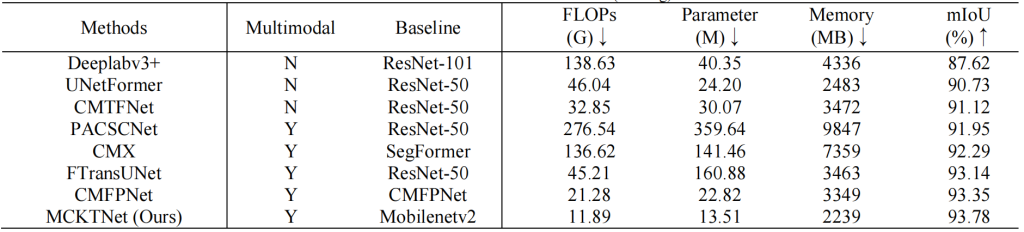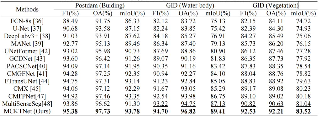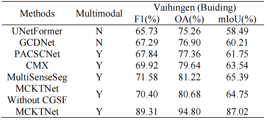在不同数据集上的实验结果验证了所提 MCKTNet 对不同模态数据的优异融合能力。与其他当前最优方法相比,MCKTNet 能高效整合不同先验知识,在建筑物、植被、水体等单类别分割任务中均实现最高精度。