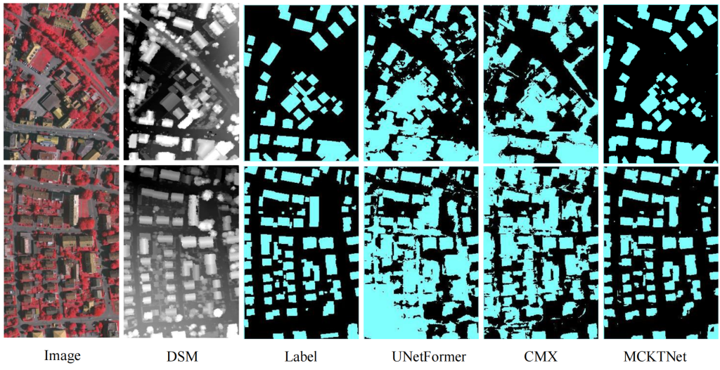 实验结果表明,MCKTNet 在有效提取图像复杂特征、精准识别目标位置与边界、泛化能力等方面均优于其他模型,成功缓解了噪声干扰、不同模态数据细节特征丢失导致的目标定位不准确和边界像素分割误差问题,解决了多模态遥感图像语义分割任务中模型稳健性不足的问题。该方法在不同数据集上均表现出色,分割结果优于其他网络。
