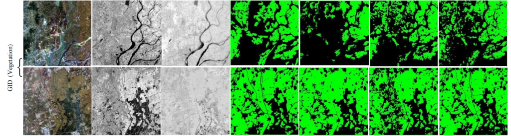 在水体检测实验中,对原始数据集重新定义:将河流、湖泊、池塘归为水体类,其他类别归为背景类,并与 NDWI 结合构建多模态 GID(水体)数据集;在植被检测实验中,将森林、草地、旱地归为植被类,其他类别归为背景类,并与 NDVI 结合构建多模态 GID(植被)数据集。
