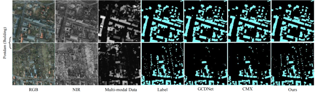 前两行是 GID(水体)数据集的测试结果,使用的多模态数据为 NDWI;中间两行是 GID(植被)数据集的测试结果,使用的多模态数据为 NDVI;最后两行是 Potsdam(建筑物)数据集的测试结果,使用的多模态数据为 DSM。