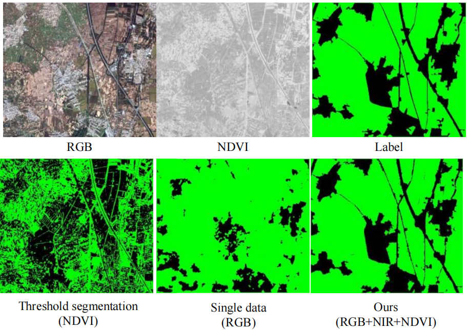 融合多模态数据实现遥感图像语义分割,可充分利用不同数据类型的互补特征,获取更全面、丰富的语义信息,进而提升语义分割的准确性与可靠性 [7]。以图 1 为例,受光照、季节、作物品种等因素影响,多光谱图像中农田区域的特征分布可能存在显著差异,有时甚至与池塘特征高度相似,仅依靠多光谱图像难以有效区分二者。而从归一化植被指数(NDVI)中提取有效特征,并与多光谱图像中的丰富纹理特征相结合,可提升复杂场景下植被检测模型的性能。因此,如何从不同模态中有效提取互补信息,获得比单一数据源更丰富的特征,已成为遥感数据处理领域的新技术挑战。