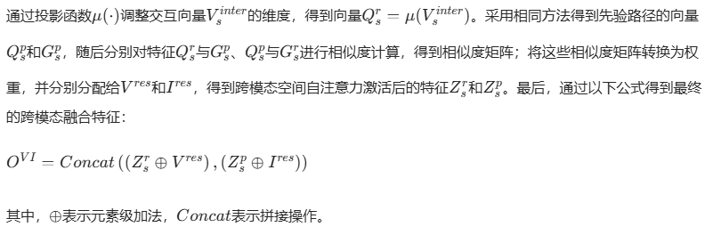 - 最终跨模态融合的特征输出将空间注意力激活后的特征与残差向量元素级加法,再通过通道拼接,得到最终的跨模态融合特征。