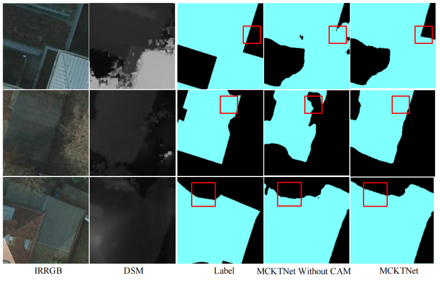 图 8:MCKTNet 与不含 CAM 模块的 MCKTNet 在 Potsdam(建筑物)数据集上的语义分割结果对比
