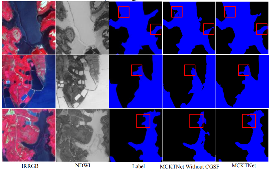 图 5:MCKTNet 与不含 CGSF 模块的 MCKTNet 在 GID(水体)数据集上的语义分割结果对比