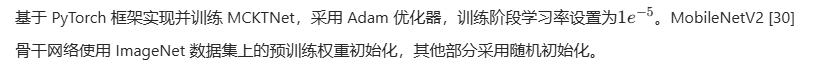 基于 PyTorch 框架实现并训练 MCKTNet,采用 Adam 优化器,训练阶段学习率设置为1×e的-5次方MobileNetV2 [30] 骨干网络使用 ImageNet 数据集上的预训练权重初始化,其他部分采用随机初始化。