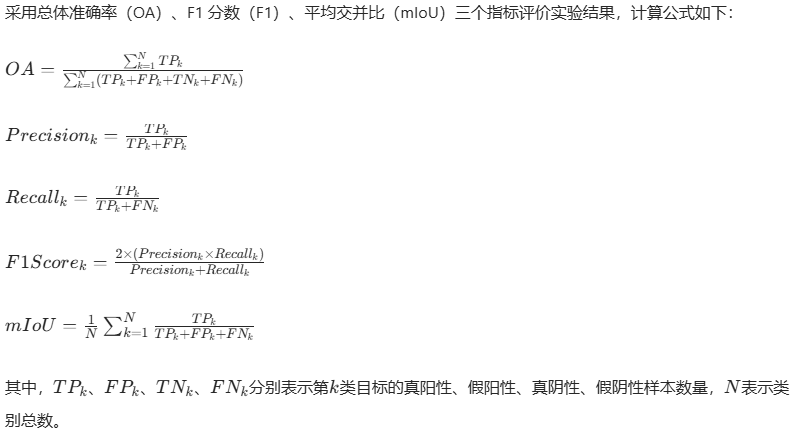 1、采用总体准确率(OA)、F1 分数(F1)、平均交并比(mIoU)三个指标评价实验结果。