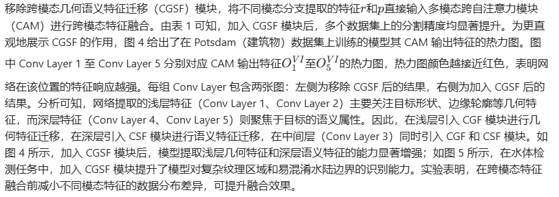 移除跨模态几何语义特征迁移(CGSF)模块,将不同模态分支提取的特征r和p直接输入多模态跨自注意力模块(CAM)进行跨模态特征融合。由表 1 可知,加入 CGSF 模块后,多个数据集上的分割精度均显著提升。为更直观地展示 CGSF 的作用,图 4 给出了在 Potsdam(建筑物)数据集上训练的模型其 CAM 输出特征的热力图。图中 Conv Layer 1 至 Conv Layer 5 分别对应 CAM 输出特征\(O_{1}^{VI}\)至\(O_{5}^{VI}\)的热力图,热力图颜色越接近红色,表明网络在该位置的特征响应越强。每组 Conv Layer 包含两张图:左侧为移除 CGSF 后的结果,右侧为加入 CGSF 后的结果。分析可知,网络提取的浅层特征(Conv Layer 1、Conv Layer 2)主要关注目标形状、边缘轮廓等几何特征,而深层特征(Conv Layer 4、Conv Layer 5)则聚焦于目标的语义属性。因此,在浅层引入 CGF 模块进行几何特征迁移,在深层引入 CSF 模块进行语义特征迁移,在中间层(Conv Layer 3)同时引入 CGF 和 CSF 模块。如图 4 所示,加入 CGSF 模块后,模型提取浅层几何特征和深层语义特征的能力显著增强;如图 5 所示,在水体检测任务中,加入 CGSF 模块提升了模型对复杂纹理区域和易混淆水陆边界的识别能力。实验表明,在跨模态特征融合前减小不同模态特征的数据分布差异,可提升融合效果。
