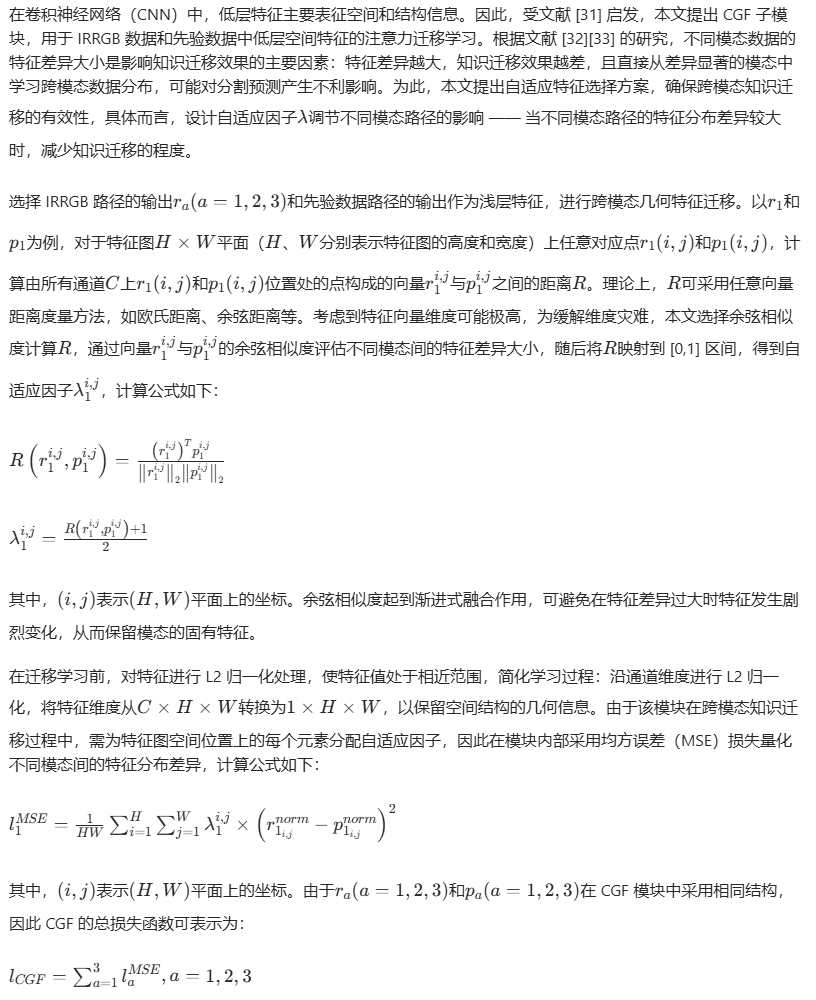 在卷积神经网络(CNN)中,低层特征主要表征空间和结构信息。因此,受文献 [31] 启发,本文提出 CGF 子模块,用于 IRRGB 数据和先验数据中低层空间特征的注意力迁移学习。根据文献 [32][33] 的研究,不同模态数据的特征差异大小是影响知识迁移效果的主要因素:特征差异越大,知识迁移效果越差,且直接从差异显著的模态中学习跨模态数据分布,可能对分割预测产生不利影响。为此,本文提出自适应特征选择方案,确保跨模态知识迁移的有效性,具体而言,设计自适应因子\(\lambda\)调节不同模态路径的影响 —— 当不同模态路径的特征分布差异较大时,减少知识迁移的程度。