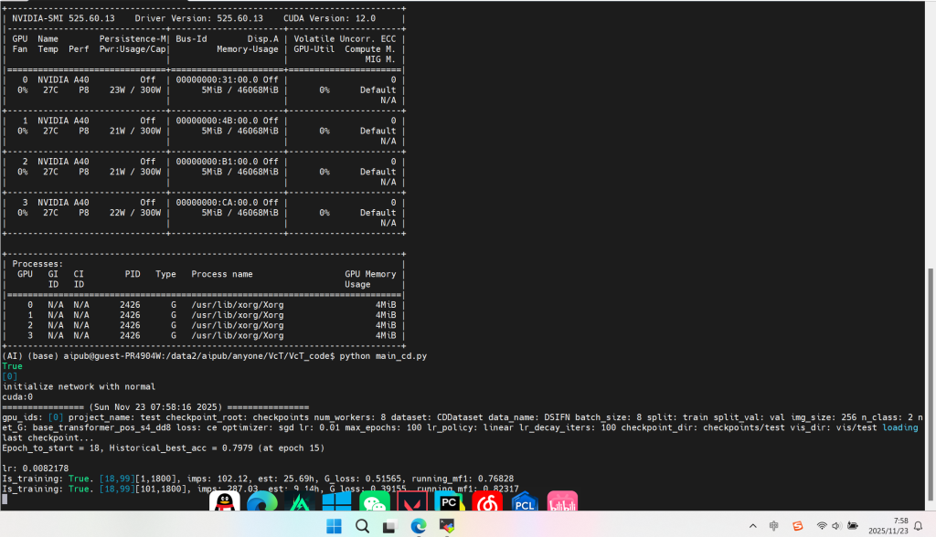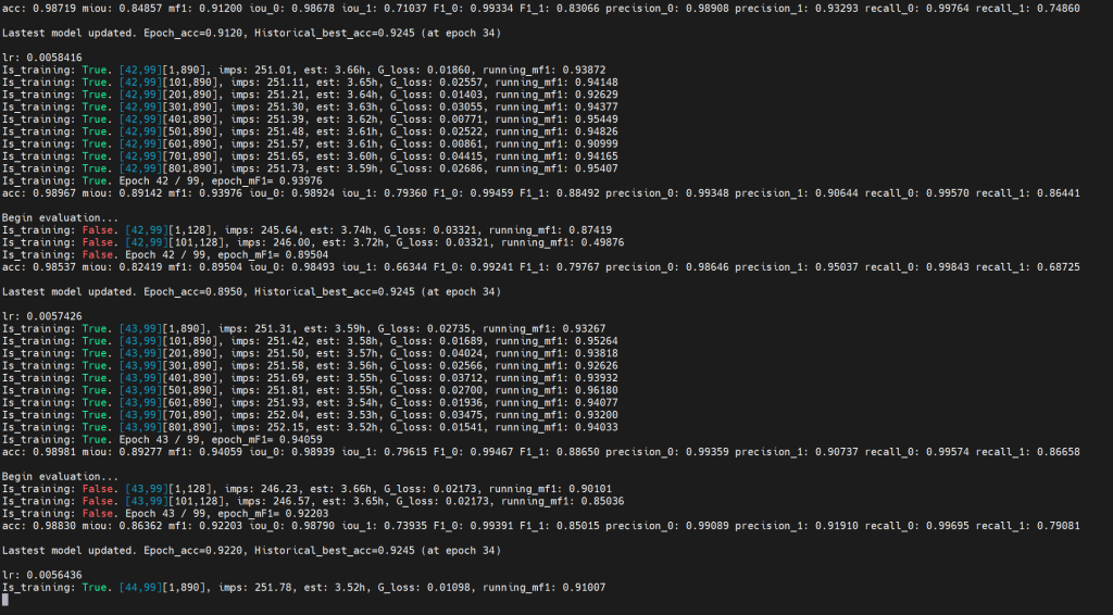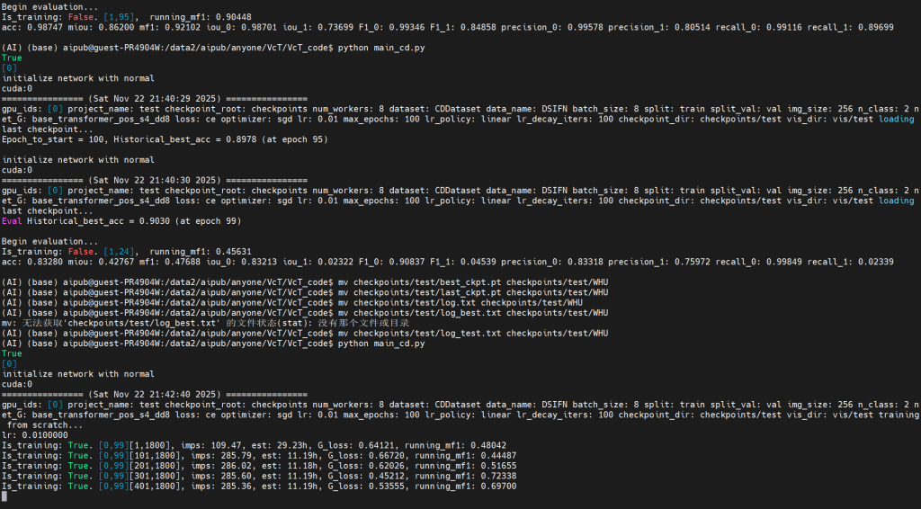 截止2025.11.22 上午11:00:使用LEVIR-CD数据集训练到50轮,发现一个问题,保存模型的时候,是直接将最优的一个模型替换掉次优的,同时保存最后一轮训练的模型(每轮训练结束之后都会覆盖保存),但是好像并没有区分是哪个数据集训练完成后的模型,这一点等我验证完第一个数据集之后再观察一下吧。