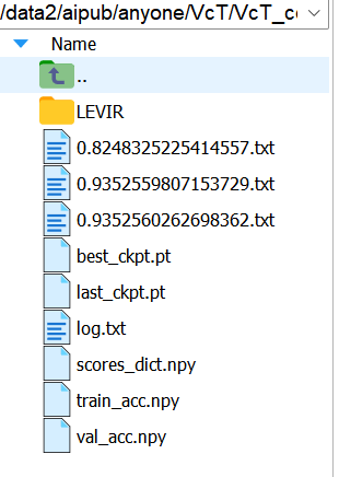 需要注意的是,即前面提到的,源码没有区分具体是哪个数据集训练出的模型,仅在模型训练py文件即main_cd.py文件中修改数据集使用,代码仍会读取保存的模型权重,同时读取到训练的轮次,在权重轮数的基础上继续训练,但当轮数超过96时(上个数据集训练了100轮)会直接跳出训练模式进入模型评估模式,因此若要继续使用不同的数据集进行训练,可以手动将保存的模型文件夹转移到其他文件夹下,如在同一文件夹下创建一个LEVIR文件夹,将各种相关的文件存入其中,如下: