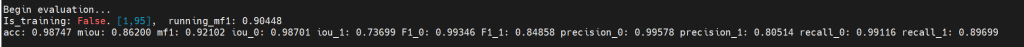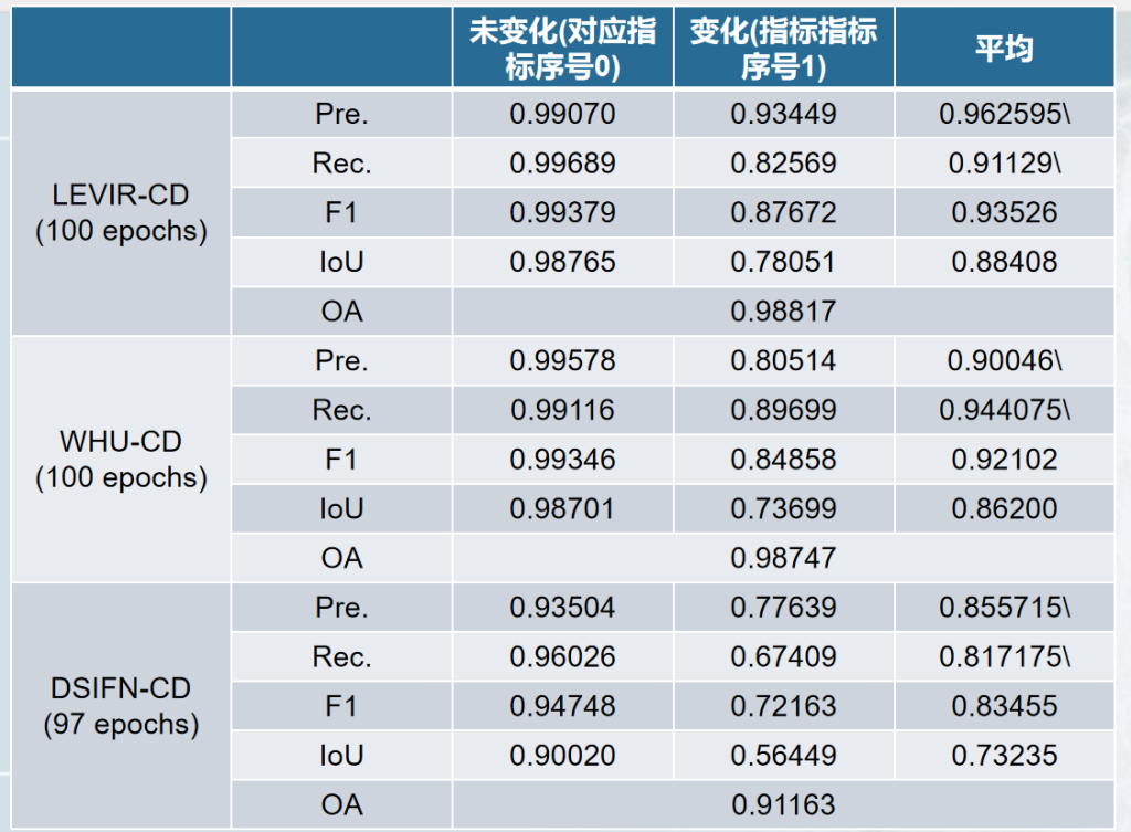 截止2025.11.22 下午15:00使用LEVIR数据集训练完成,训练时间:上午8:30~下午15:00,在验证集上的指标如下: