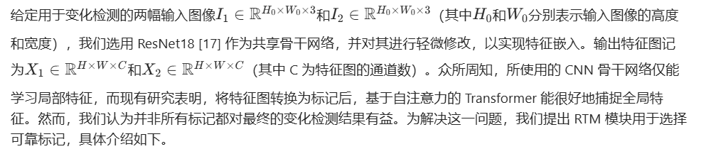 给定用于变化检测的两幅输入图像\(I_{1} \in \mathbb{R}^{H_{0} \times W_{0} \times 3}\)和\(I_{2} \in \mathbb{R}^{H_{0} \times W_{0} \times 3}\)(其中\(H_{0}\)和\(W_{0}\)分别表示输入图像的高度和宽度),我们选用 ResNet18 [17] 作为共享骨干网络,并对其进行轻微修改,以实现特征嵌入。输出特征图记为\(X_{1} \in \mathbb{R}^{H \times W \times C}\)和\(X_{2} \in \mathbb{R}^{H \times W \times C}\)(其中 C 为特征图的通道数)。众所周知,所使用的 CNN 骨干网络仅能学习局部特征,而现有研究表明,将特征图转换为标记后,基于自注意力的 Transformer 能很好地捕捉全局特征。然而,我们认为并非所有标记都对最终的变化检测结果有益。为解决这一问题,我们提出 RTM 模块用于选择可靠标记,具体介绍如下。
