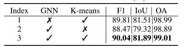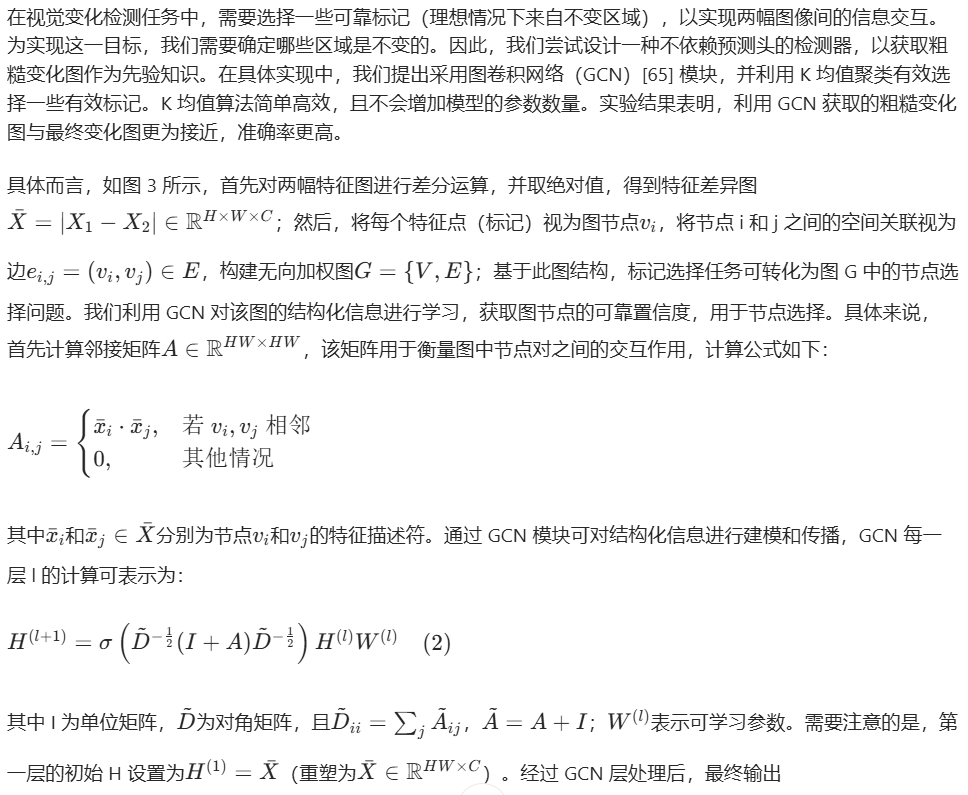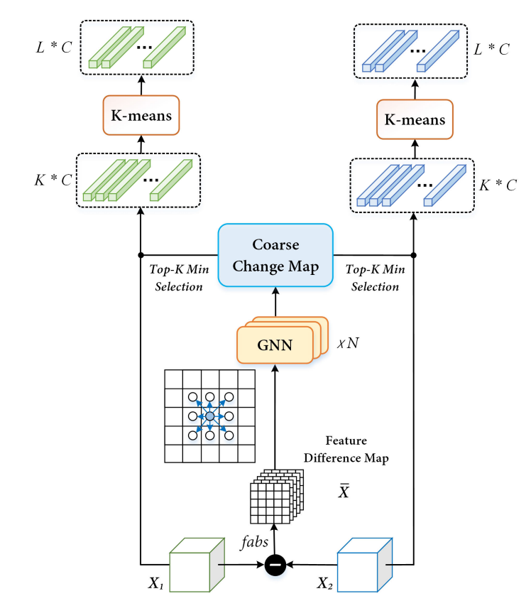在视觉变化检测任务中,需要选择一些可靠标记(理想情况下来自不变区域),以实现两幅图像间的信息交互。为实现这一目标,我们需要确定哪些区域是不变的。因此,我们尝试设计一种不依赖预测头的检测器,以获取粗糙变化图作为先验知识。在具体实现中,我们提出采用图卷积网络(GCN)[65] 模块,并利用 K 均值聚类有效选择一些有效标记。K 均值算法简单高效,且不会增加模型的参数数量。实验结果表明,利用 GCN 获取的粗糙变化图与最终变化图更为接近,准确率更高。