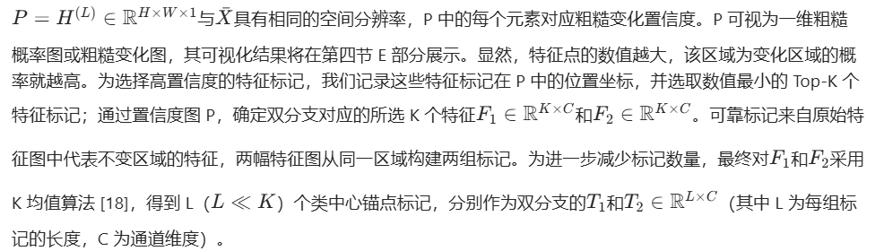 其中 I 为单位矩阵,\(\tilde{D}\)为对角矩阵,且\(\tilde{D}_{ii}=\sum_{j} \tilde{A}_{ij}\),\(\tilde{A}=A+I\);\(W^{(l)}\)表示可学习参数。需要注意的是,第一层的初始 H 设置为\(H^{(1)}=\bar{X}\)(重塑为\(\bar{X} \in \mathbb{R}^{HW \times C}\))。经过 GCN 层处理后,最终输出\(P=H^{(L)} \in \mathbb{R}^{H \times W \times 1}\)与\(\bar{X}\)具有相同的空间分辨率,P 中的每个元素对应粗糙变化置信度。P 可视为一维粗糙概率图或粗糙变化图,其可视化结果将在第四节 E 部分展示。显然,特征点的数值越大,该区域为变化区域的概率就越高。为选择高置信度的特征标记,我们记录这些特征标记在 P 中的位置坐标,并选取数值最小的 Top-K 个特征标记;通过置信度图 P,确定双分支对应的所选 K 个特征\(F_{1} \in \mathbb{R}^{K \times C}\)和\(F_{2} \in \mathbb{R}^{K \times C}\)。可靠标记来自原始特征图中代表不变区域的特征,两幅特征图从同一区域构建两组标记。为进一步减少标记数量,最终对\(F_{1}\)和\(F_{2}\)采用 K 均值算法 [18],得到 L(\(L \ll K\))个类中心锚点标记,分别作为双分支的\(T_{1}\)和\(T_{2} \in \mathbb{R}^{L \times C}\)(其中 L 为每组标记的长度,C 为通道维度)。
