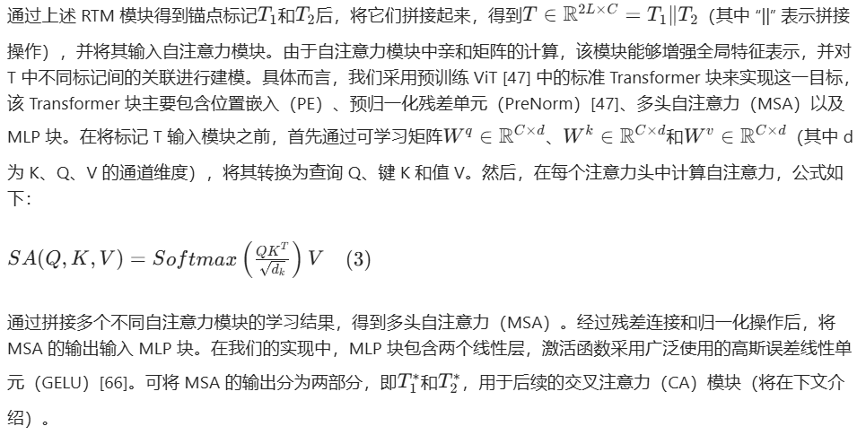 通过上述 RTM 模块得到锚点标记\(T_{1}\)和\(T_{2}\)后,将它们拼接起来,得到\(T \in \mathbb{R}^{2L \times C}=T_{1} \| T_{2}\)(其中 “||” 表示拼接操作),并将其输入自注意力模块。由于自注意力模块中亲和矩阵的计算,该模块能够增强全局特征表示,并对 T 中不同标记间的关联进行建模。具体而言,我们采用预训练 ViT [47] 中的标准 Transformer 块来实现这一目标,该 Transformer 块主要包含位置嵌入(PE)、预归一化残差单元(PreNorm)[47]、多头自注意力(MSA)以及 MLP 块。在将标记 T 输入模块之前,首先通过可学习矩阵\(W^{q} \in \mathbb{R}^{C \times d}\)、\(W^{k} \in \mathbb{R}^{C \times d}\)和\(W^{v} \in \mathbb{R}^{C \times d}\)(其中 d 为 K、Q、V 的通道维度),将其转换为查询 Q、键 K 和值 V。然后,在每个注意力头中计算自注意力,公式如下: