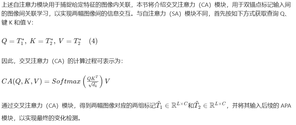 上述自注意力模块用于捕捉给定特征的图像内关联,本节将介绍交叉注意力(CA)模块,用于双锚点标记输入间的图像间关联学习,以实现两幅图像间的信息交互。与自注意力(SA)模块不同,首先按如下方式获取查询 Q、键 K 和值 V: