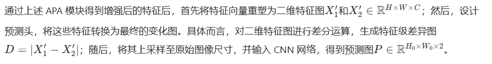 • 预测头该部分的处理:经过锚点-注意力与骨干网络提取的特征融合完成后的两幅特征图做差分运算,得到特征级差异图,然后通过卷积网络(图中堆叠的模块)将差异图转换为最终的变化图(change map)实现像素级的变化区域检测。