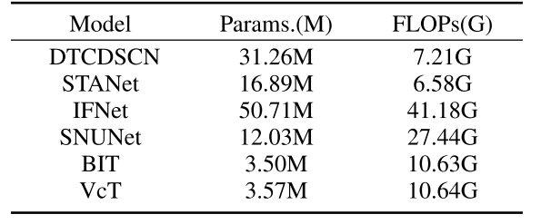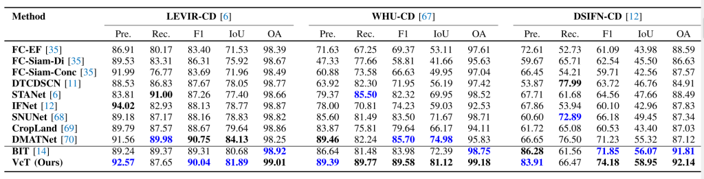 • 实验验证在LEVIR-CD、WHU-CD、DSIFN-CD三大遥感变化检测基准数据集上,VcT模型相较于10种主流方法进行实验,验证VcT设计的可行性。