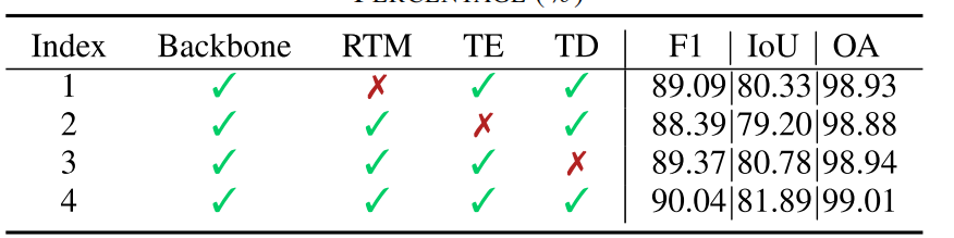 粗糙变化图:如图 6 所示,对部分代表性样本的粗糙变化图进行了可视化。结果表明,所提 RTM 模块能够初步大致捕捉公共不变区域,从而得到更准确的粗糙变化图。