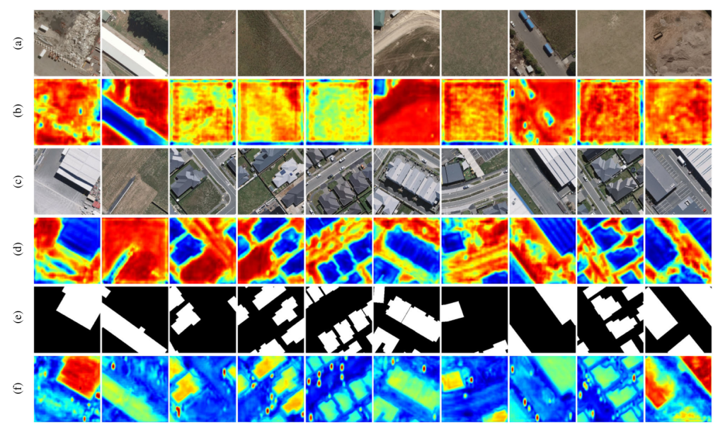 图 5 WHU-CD 测试集上的特征图可视化示例。红色和蓝色分别表示较高和较低的注意力值。(a)图像 A;(b)图像 A 的差异特征图;(c)图像 B;(d)图像 B 的差异特征图;(e)ground truth;(f)差异图像。