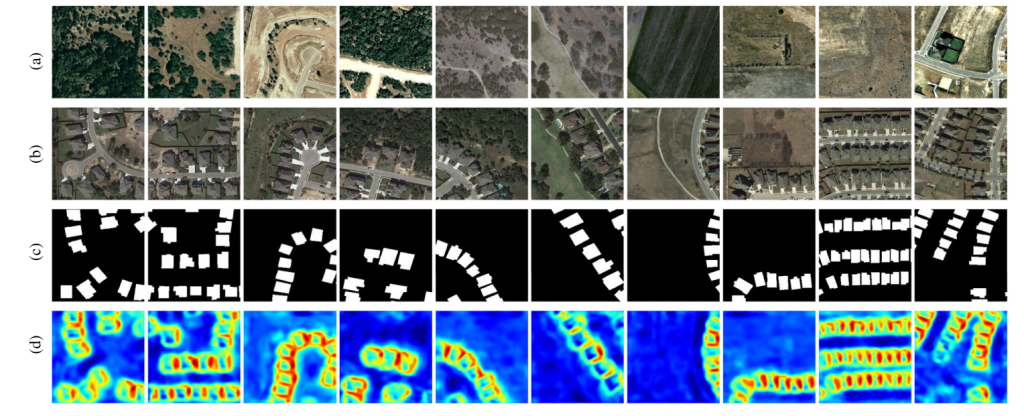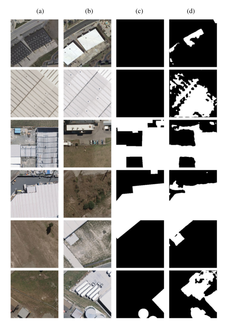 图 6 LEVIR-CD 测试集上代表性粗糙变化图的可视化结果。(a)图像 A;(b)图像 B;(c)ground truth;(d)粗糙变化图。