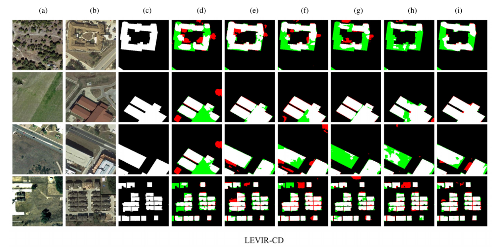 检测结果:除特征图可视化外,还对比展示了所提 VcT 模型与其他最优模型的变化区域检测结果。为便于可视化,采用不同颜色表示 TP(白色)、TN(黑色)、FP(红色)和 FN(绿色)。具体而言,如图 7 所示,(a)-(c)列分别表示输入图像 A、输入图像 B 和 ground truth 图;(d)-(h)列表示其他对比方法的变化检测结果,这些结果明显劣于所提 VcT 模型的检测结果(i 列)。这充分证明了所提 VcT 模型在遥感图像变化检测中的优势。