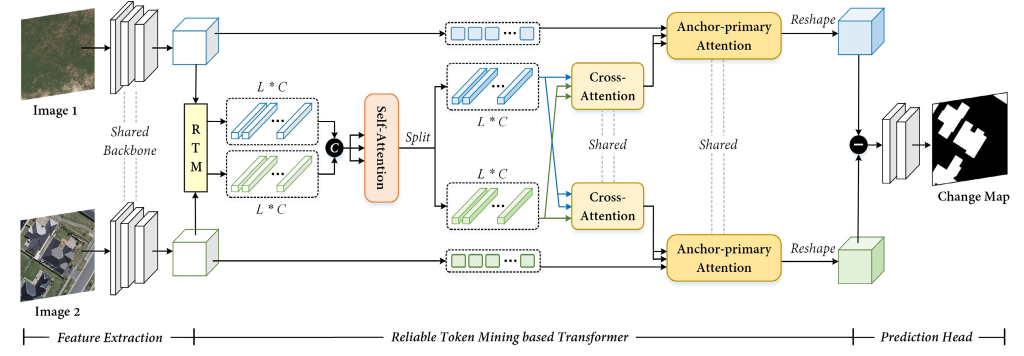 • 基于可靠性标记挖掘的Transformer模型的核心创新部分:可靠性标记挖掘RTM模块,对两幅图像的特征图进行处理,通过“图神经网络+Top-K筛选+K均值聚类”,从特征中挖掘出代表不变背景区域的可靠标记(图中“L*C”的标记块),分别得到对应image1的蓝色标记和image2的绿色标记。自注意力:将两幅图像的可靠性标记进行拼接后,通过自注意力模块建模标记间的全局关联,增强特征表示。拆分与交叉注意力:把增强后的标记拆分为对应image1、image2的两组标记,再通过交叉注意力实现两幅图像标记间的信息交互,学习图像间的关联。锚点-主注意力:将交叉注意力输出的标记,与原始骨干网络提取的特征进行融合,进一步细化特征表示,同时通过reshape操作将标记恢复为特征图格式。