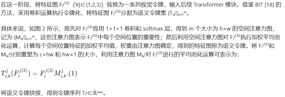 在这一阶段,将特征图 Fᵢʲ⁽³⁾(∀j∈{1,2,3})转换为一系列视觉令牌,输入后续 Transformer 模块。借鉴 BIT [18] 的方法,采用卷积运算执行令牌化,将特征图 Fᵢʲ⁽³⁾分割为语义令牌集 {Tᵢₖʲ}ₖ₌₁ᵐ。