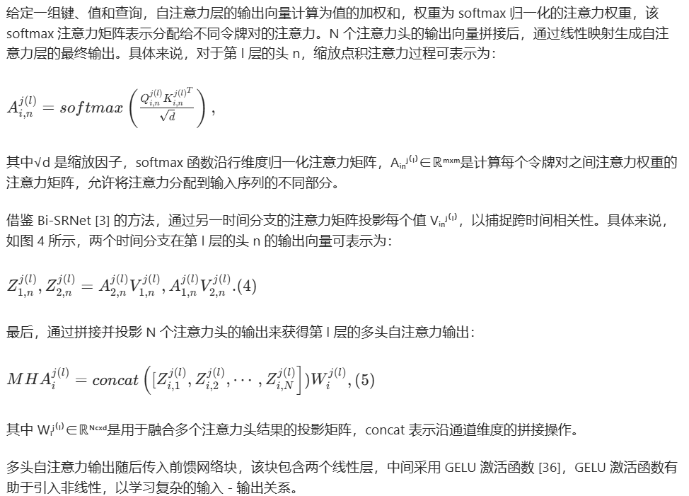 借鉴 Bi-SRNet [3] 的方法,通过另一时间分支的注意力矩阵投影每个值 Vᵢₙʲ⁽ˡ⁾,以捕捉跨时间相关性。具体来说,如图 4 所示,两个时间分支在第 l 层的头 n 的输出向量可表示为:\(Z_{1,n}^{j(l)},Z_{2,n}^{j(l)}=A_{2,n}^{j(l)}V_{1,n}^{j(l)},A_{1,n}^{j(l)}V_{2,n}^{j(l)}. (4)\)