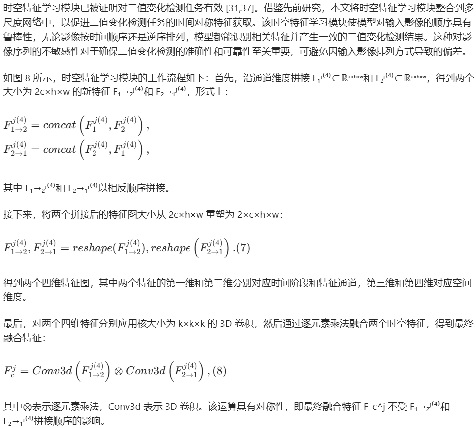 如图 8 所示,时空特征学习模块的工作流程如下:首先,沿通道维度拼接 F₁ʲ⁽⁴⁾∈ℝᶜˣʰˣʷ和 F₂ʲ⁽⁴⁾∈ℝᶜˣʰˣʷ,得到两个大小为 2c×h×w 的新特征 F₁→₂ʲ⁽⁴⁾和 F₂→₁ʲ⁽⁴⁾,形式上:\(\begin{aligned} & F_{1 \to 2}^{j(4)}=concat\left(F_{1}^{j(4)}, F_{2}^{j(4)}\right), \\ & F_{2 \to 1}^{j(4)}=concat\left(F_{2}^{j(4)}, F_{1}^{j(4)}\right), \end{aligned}\)其中 F₁→₂ʲ⁽⁴⁾和 F₂→₁ʲ⁽⁴⁾以相反顺序拼接。