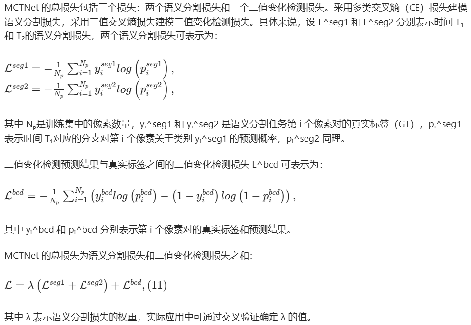 MCTNet 的总损失为语义分割损失和二值变化检测损失之和:\(\mathcal{L}=\lambda\left(\mathcal{L}^{seg 1}+\mathcal{L}^{seg 2}\right)+\mathcal{L}^{bcd }, (11)\)其中 λ 表示语义分割损失的权重,实际应用中可通过交叉验证确定 λ 的值。