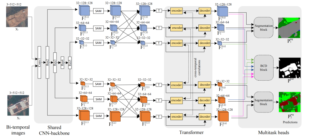 1. 设计了一种多任务 CNN-Transformer 网络,专门用于高效挖掘和利用语义分割与二值变化检测的相关性,旨在同时提升两个任务的整体性能。