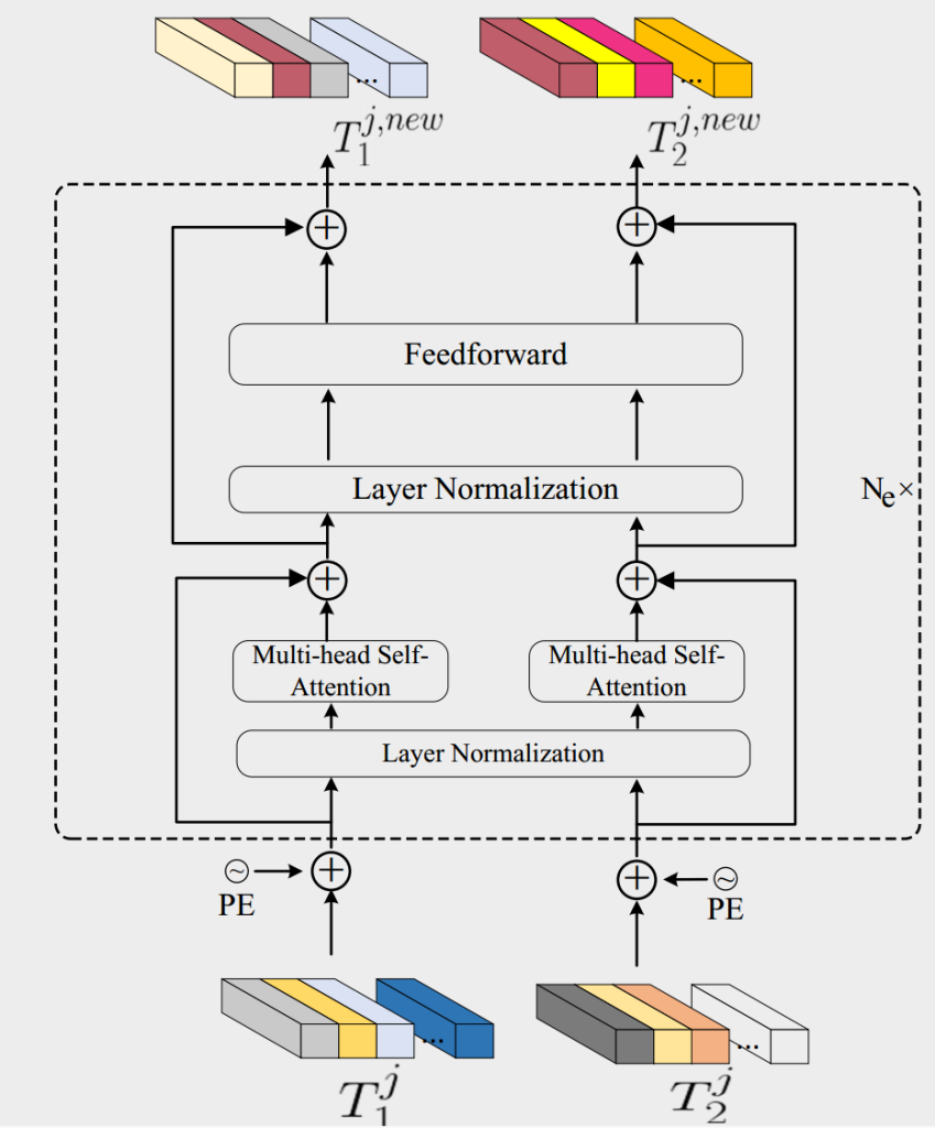 在将令牌集 Tᵢʲ(∀i∈{1,2})输入 Transformer 编码器之前,添加可学习的位置编码 Pᵢʲ∈ℝᵐˣᶜ:Tᵢʲ=Tᵢʲ+Pᵢʲ。在 Transformer 编码器的第 l 层,嵌入 Tᵢʲ⁽ˡ⁻¹⁾传入多头自注意力块,通过 N 个独立的注意力头将其投影到多个特征子空间。N 个注意力头不共享权重,每个注意力头包含两个主要组件:转换层和自注意力层。