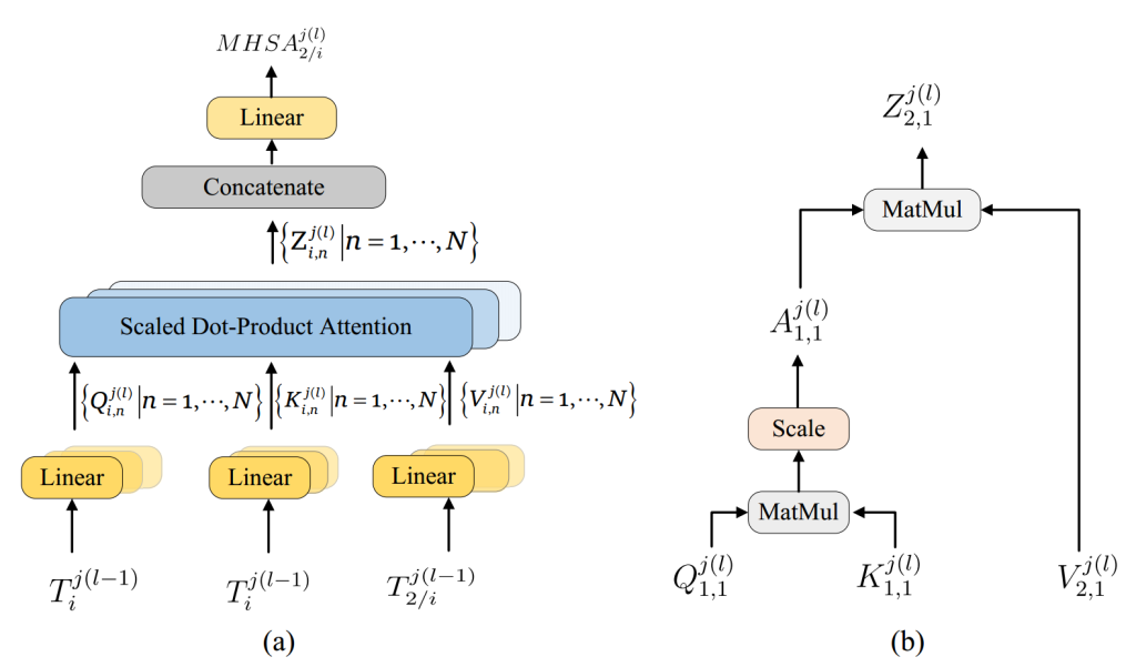 多头自注意力头 n 的转换层将输入向量 Tᵢʲ⁽ˡ⁻¹⁾映射为查询(Qᵢₙʲ⁽ˡ⁾∈ℝᵐˣᵈ)、键(Kᵢₙʲ⁽ˡ⁾∈ℝᵐˣᵈ)和值(Vᵢₙʲ⁽ˡ⁾∈ℝᵐˣᵈ)。具体来说,对于第 l 层的头 n,线性转换可表示为:\(\begin{aligned} & Q_{i, n}^{j(l)}=T_{i}^{j(l-1)} W_{i, n}^{q, j(l)}, \\ & K_{i, n}^{j(l)}=T_{i}^{j(l-1)} W_{i, n}^{k, j(l)}, \\ & V_{i, n}^{j(l)}=T_{i}^{j(l-1)} W_{i, n}^{v, j(l)}, \end{aligned}\)其中 Wᵢₙᵠʲ⁽ˡ⁾∈ℝᶜˣᵈ、Wᵢₙᵏʲ⁽ˡ⁾∈ℝᶜˣᵈ和 Wᵢₙᵛʲ⁽ˡ⁾∈ℝᶜˣᵈ是线性矩阵。