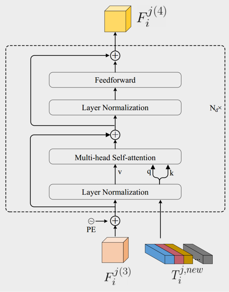 图5. Transformer解码器过程的图示。同时输入特征F j(3)i和3D令牌嵌入T j,new i,从而产生输出特征F j(4)i。Nd表示相同层的数量。