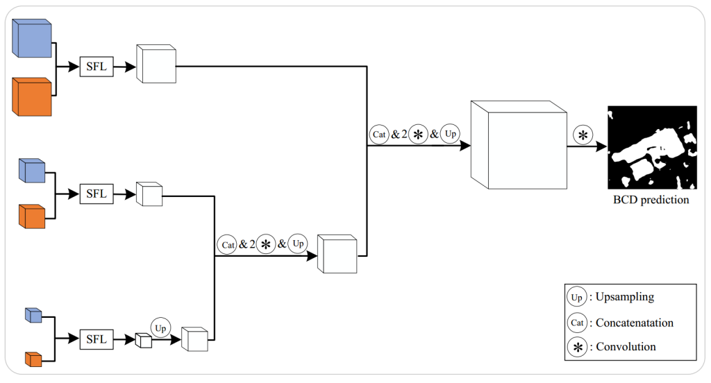 时空特征学习模块已被证明对二值变化检测任务有效 [31,37]。借鉴先前研究,本文将时空特征学习模块整合到多尺度网络中,以促进二值变化检测任务的时间对称特征获取。该时空特征学习模块使模型对输入影像的顺序具有鲁棒性,无论影像按时间顺序还是逆序排列,模型都能识别相关特征并产生一致的二值变化检测结果。这种对影像序列的不敏感性对于确保二值变化检测的准确性和可靠性至关重要,可避免因输入影像排列方式导致的偏差。