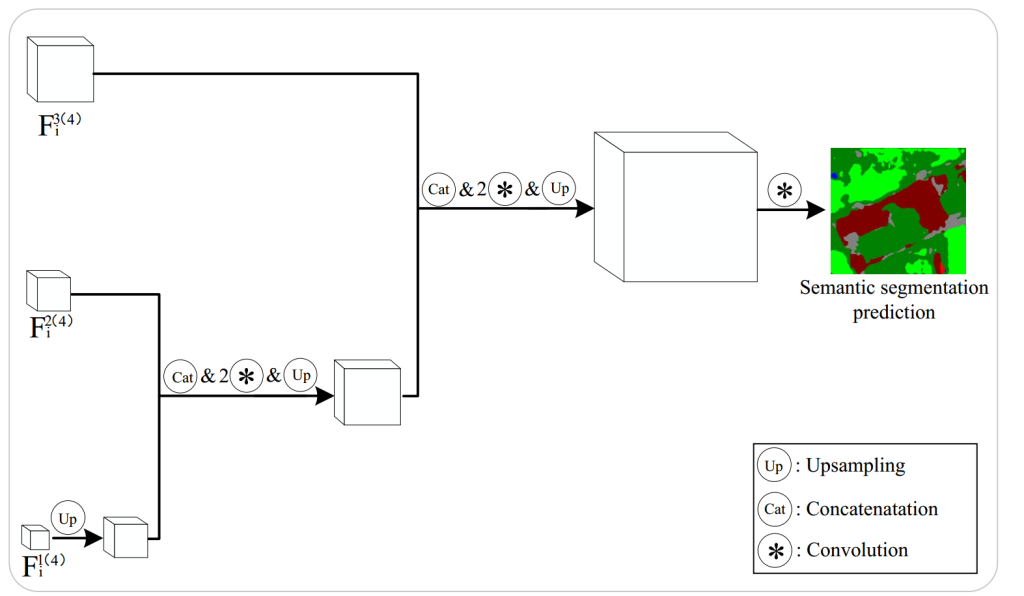多任务头使模型能够利用不同任务间的共享表示,提高两个任务的性能。语义分割和二值变化检测均为像素级分类任务,为简化模型,两者采用相同的网络架构,仅进行少量修改:两个语义分割头共享权重,而二值变化检测头具有独立权重。如图 6 和图 7 所示,采用的架构是类 UNet [6] 网络,包含三个 2 倍上采样块,每个上采样块采用最近邻上采样,其中两个上采样块前应用两个 3×3 卷积层。除时空特征学习模块外,语义分割头和二值变化检测头的主要区别在于输出通道数:二值变化检测头有两个通道(对应变化和未变化区域),而语义分割头的通道数等于预定义的语义类别数。