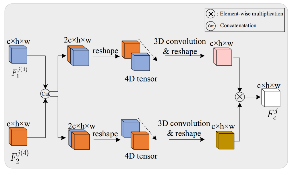 接下来,将两个拼接后的特征图大小从 2c×h×w 重塑为 2×c×h×w:\(F_{1 \to 2}^{j(4)},F_{2 \to 1}^{j(4)}=reshape(F_{1\to 2}^{j(4)}), reshape\left(F_{2\to 1}^{j(4)}\right) . (7)\)
