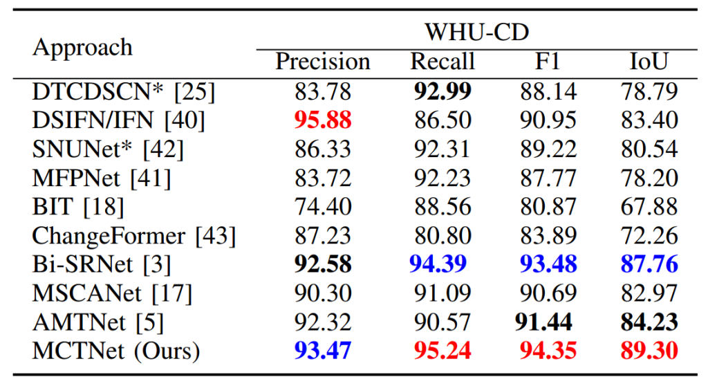WHU-CD:如表 1 所示,MCTNet 在该数据集上取得了新的最先进结果,具体而言,MCTNet 的召回率最高(95.24%)、F1 分数最佳(94.35%)、交并比最高(89.30%),精确率排名第二(93.47%)。排名第二的模型是 Bi-SRNet,其精确率为 92.58%、召回率为 94.39%、F1 分数为 93.48%、交并比为 87.76%,整体表现优异。与 Bi-SRNet 相比,MCTNet 的精确率提高了 0.89%,召回率提高了 0.85%,F1 分数提高了 0.87%,交并比提高了 1.54%。单任务孪生 CNN-Transformer 网络 AMTNet 排名第三。MCTNet 和 Bi-SRNet 的性能提升可能归功于多任务架构。值得注意的是,精确率和召回率存在权衡关系(提高召回率可能降低精确率,反之亦然)。例如,DSIFN/IFN 的精确率最高,但召回率不高。如表 1 所示,对比算法的性能已非常高,提升空间有限。