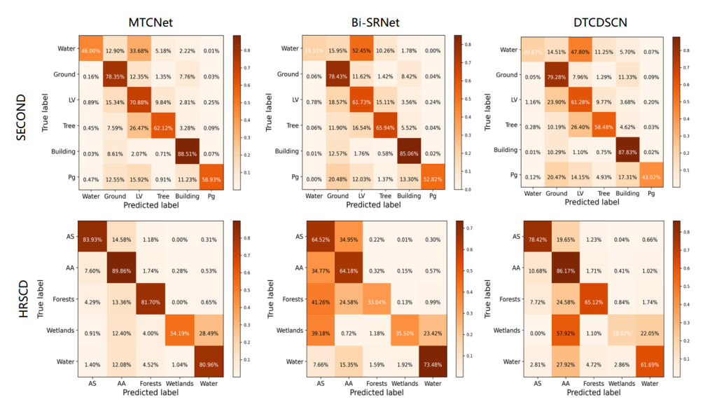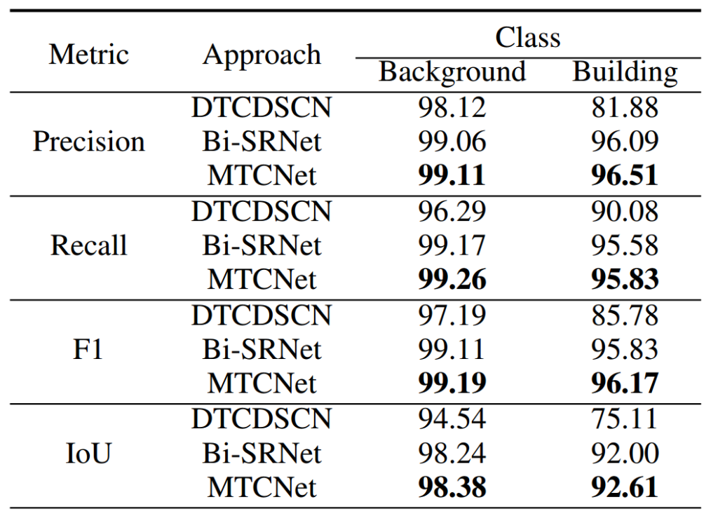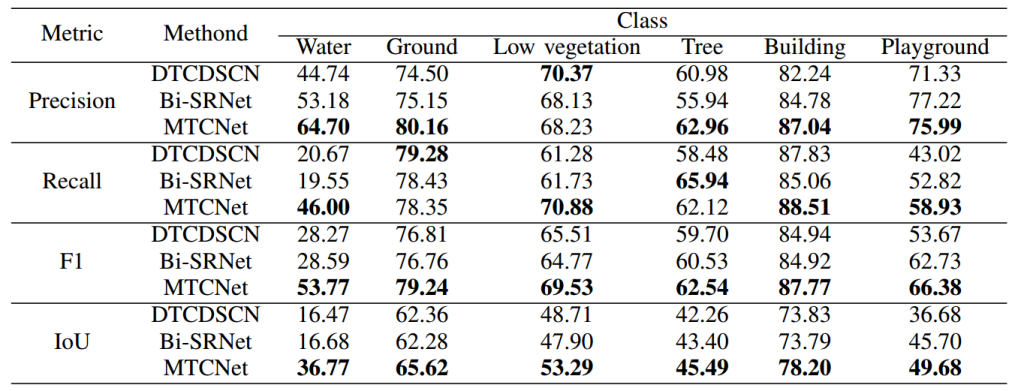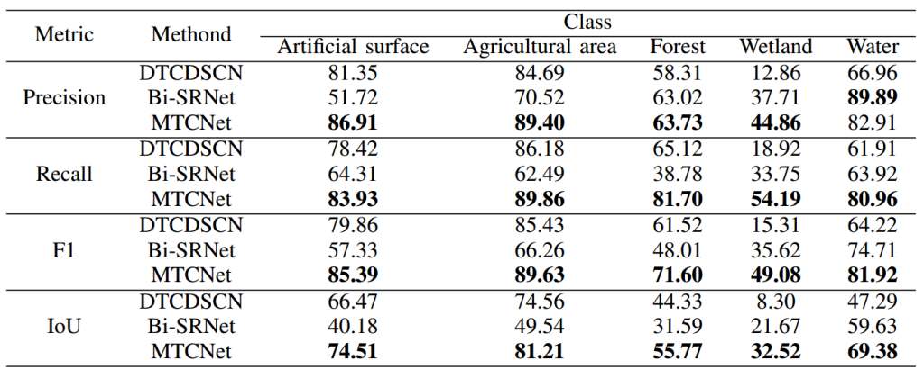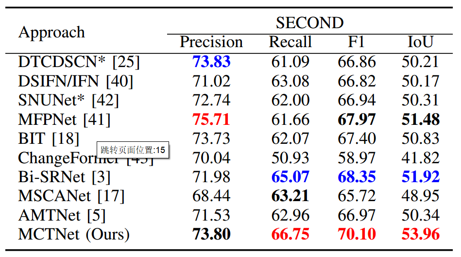 SECOND:如表 2 所示,MCTNet 在二值变化检测任务中取得了最佳整体结果,召回率为 66.75%、F1 分数为 70.10%、交并比为 53.96%。排名第二的是 Bi-SRNet,其精确率为 65.07%、召回率为 68.35%、F1 分数为 66.67%、交并比为 51.92%。与 Bi-SRNet 相比,MCTNet 的精确率提高了 1.82%,召回率提高了 1.68%,F1 分数提高了 1.75%,交并比提高了 2.04%。纯 CNN 模型 MFPNet 在该数据集上排名第三,其优异性能归功于其复杂的架构,该架构整合了多尺度特征和注意力模块。