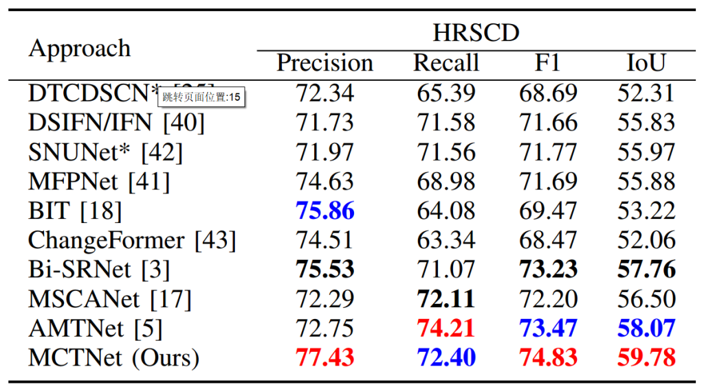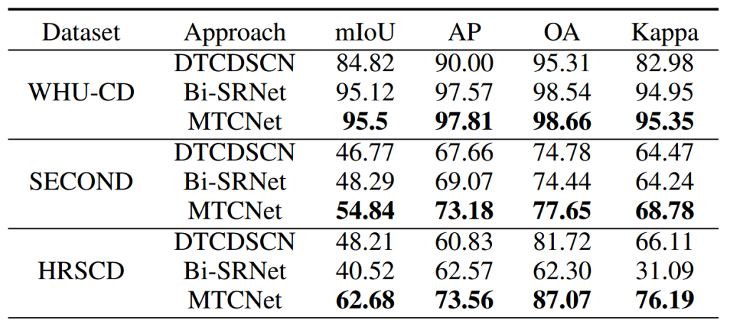 HRSCD:如表 3 所示,MCTNet 在 HRSCD 数据集的二值变化检测任务中表现优异,取得了最佳整体结果,精确率为 77.43%、召回率为 72.40%、F1 分数为 74.83%、交并比为 59.78%。CNN-Transformer 网络 AMTNet 排名第二,其精确率为 72.75%、召回率为 74.21%、F1 分数为 73.47%、交并比为 58.07%,其强大性能归功于其复杂的架构,该架构整合了卷积网络、Transformer、多尺度和注意力机制,能有效捕捉空间依赖关系。与 AMTNet 相比,MCTNet 的精确率提高了 4.68%,F1 分数提高了 1.36%,交并比提高了 1.71%。排名第三的是 Bi-SRNet,其精确率为 75.53%、召回率为 71.07%、F1 分数为 73.23%、交并比为 57.76%,表现同样出色。
